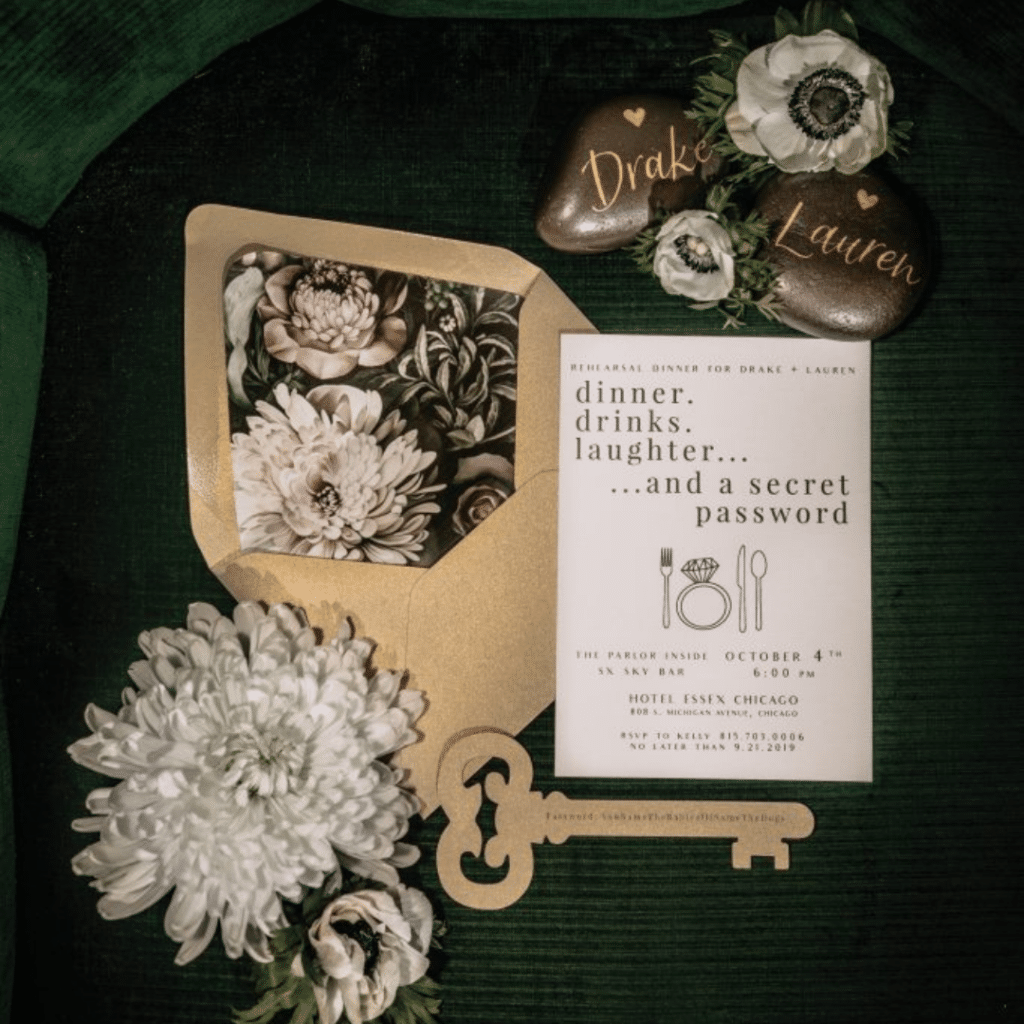 Kelly Delamater of Backyard Soiree Weddings & Events says, “A rehearsal dinner is the kick-off for a weekend of memory making. It must rise to the occasion and complement, not compete with, the wedding that awaits. A password was required in order to enter and partake in champagne toasts and personal cakes in crystal coupes. Cheers to a kickin’ kick-off!”