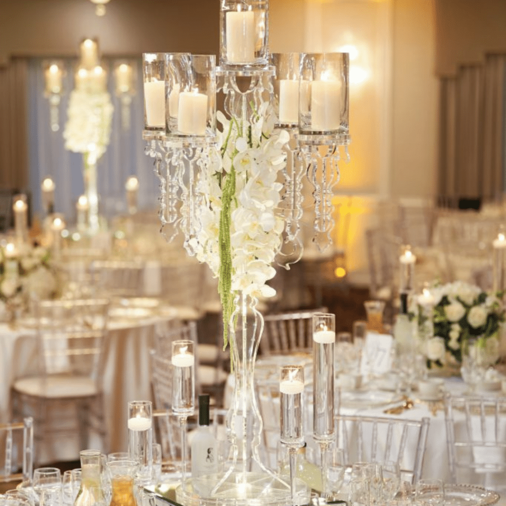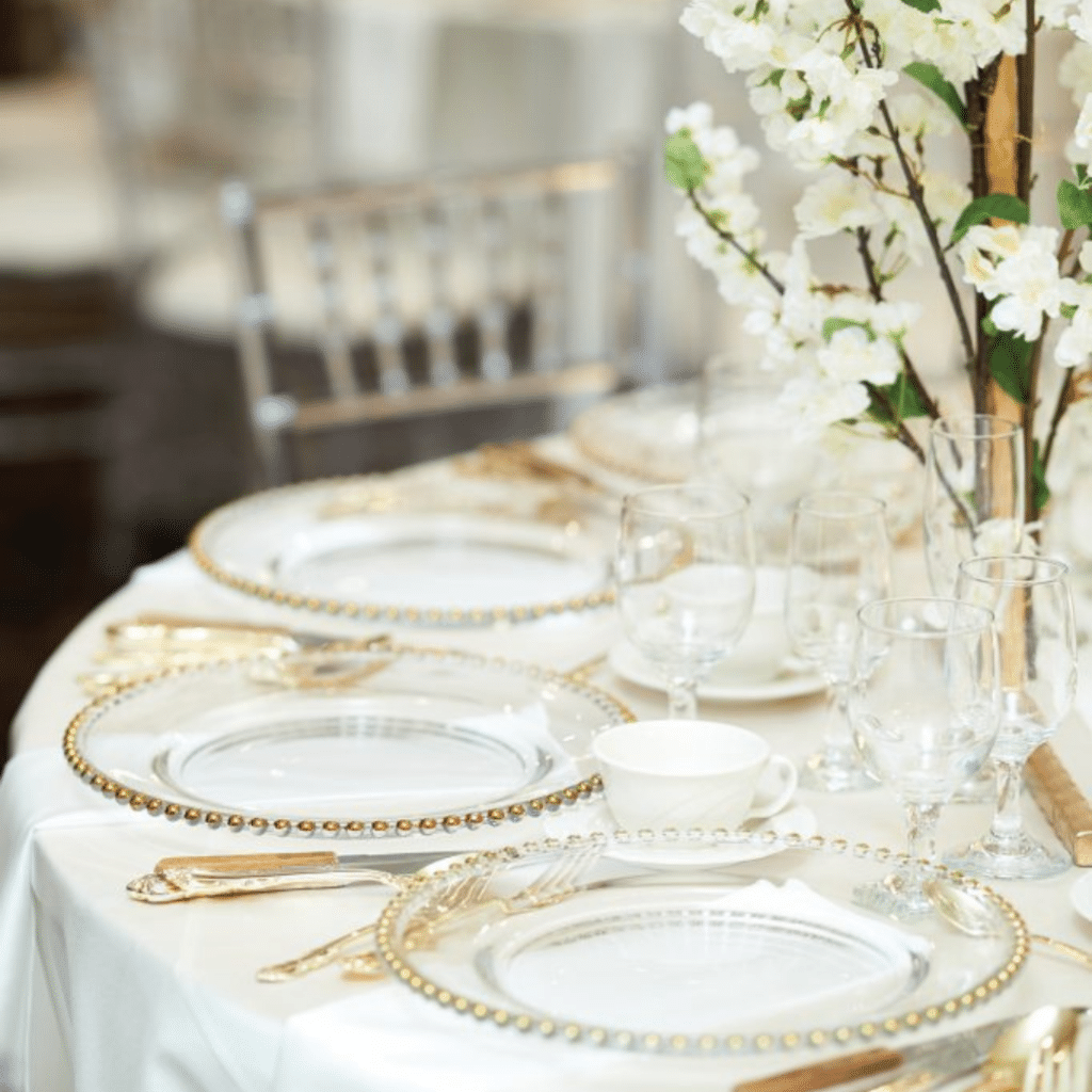 For Sylvia and Sebastian’s wedding, our Crystal Chiavari Chairs and Gold Beaded Chargers played a pivotal role in creating a truly magical atmosphere. The Crystal Chiavari Chairs added a touch of glamour and sparkle, reflecting light throughout the space, while the Gold Beaded Chargers elevated the table settings with their intricate details touch of gold.