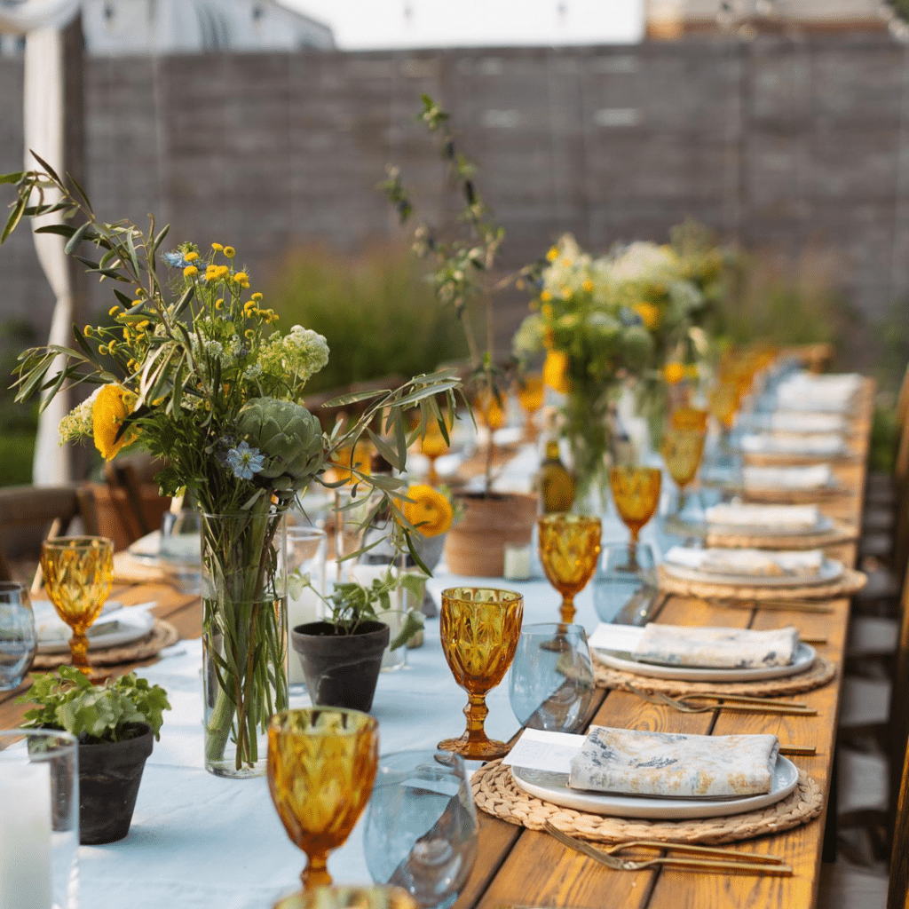 Continuing the summer soirée, we ventured into the Italian countryside with the aptly named “Italian Countryside Urban Farm Dinner.” Here, our goal was to evoke the charm of Tuscany and the azure skies of the Mediterranean. To achieve this, we supplied Amber Highland Goblets, Blue Stemless All-Purpose Glassware, and Contemporary Brushed Gold Flatware. These elements paired seamlessly with baby blue linens from BBJ La Tavola and stemmy florals, creating a tablescape that transported guests to an Italian villa. The play of colors and textures made for an unforgettable evening of dining under the stars.