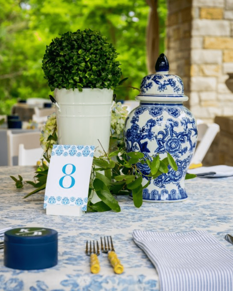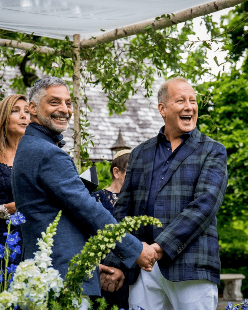 Kenny and Brad curated a wedding that mirrored the enchantment of their everyday lives. The Redfield Estate at The Grove provided the perfect backdrop for their vintage garden party. As the couple exchanged vows beneath a birch chuppah in the summer air, guests were treated to a visual feast of lanterns, hydrangeas, and antique chinoiserie vases, all gracefully arranged on an assortment of blue-and-white patterned linens from BBJ La Tavola.