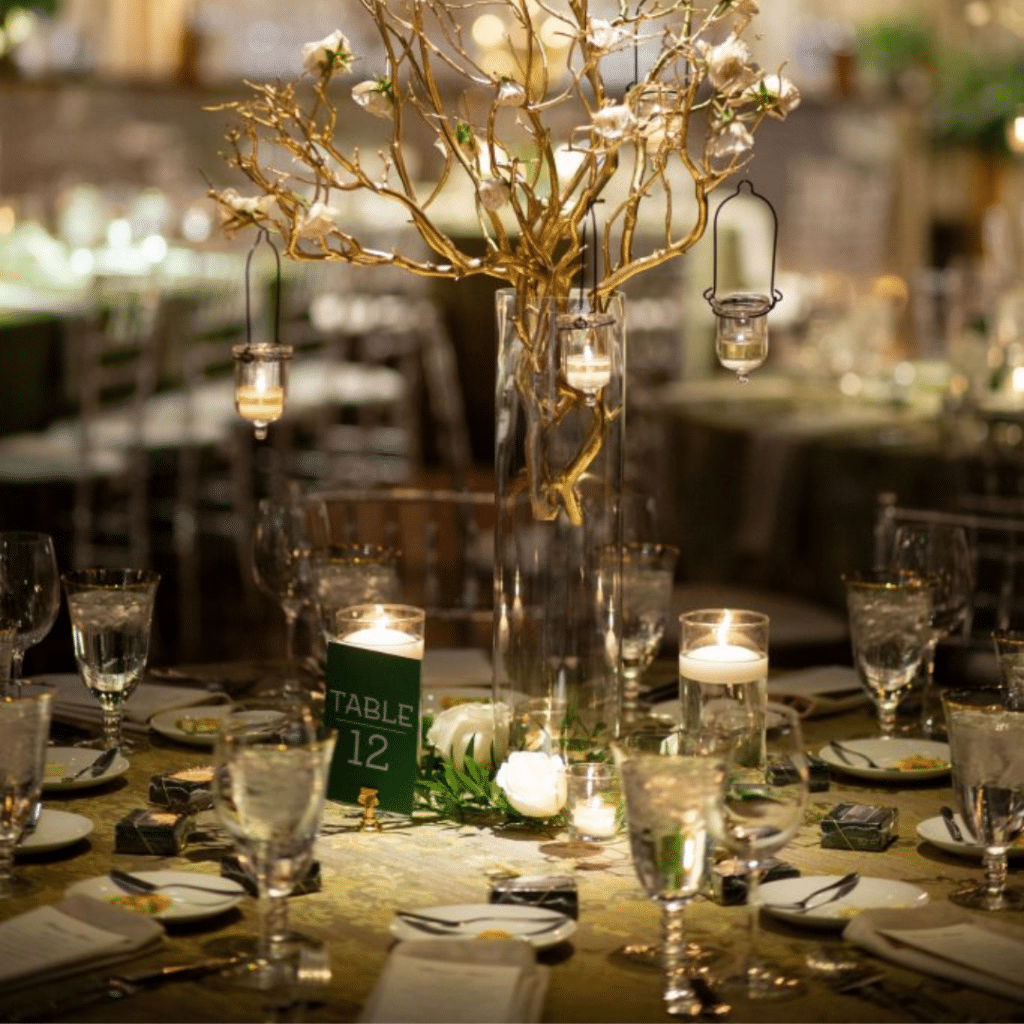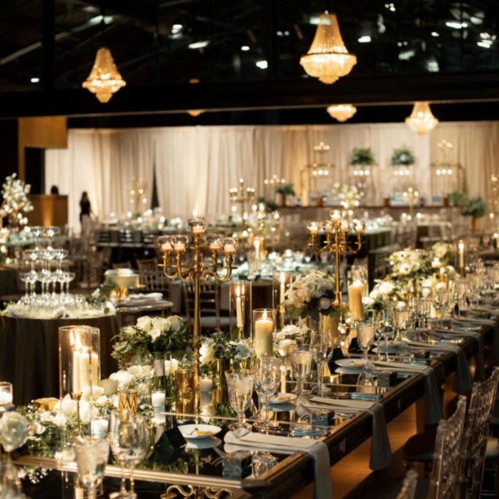 Tablescapes Event Rentals, the creative force behind the table top decor, provided the perfect complement to the opulence of the event. The Fine Gold-Rimmed Glassware, chosen with meticulous attention to detail, added a touch of glamor to the mirrored tables. The delicate gold rims glinted in the ambient light, creating a visual symphony that echoed the elegance of the roaring twenties.
