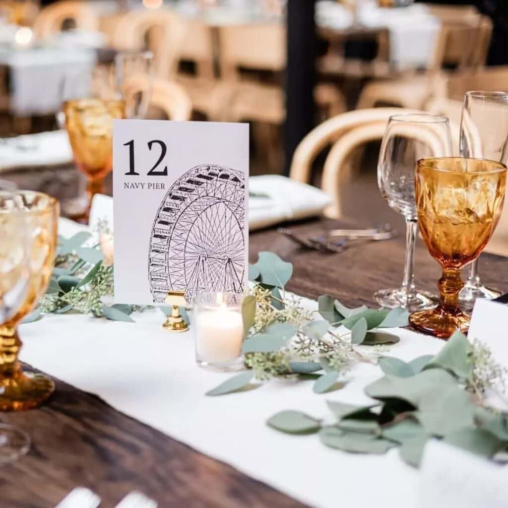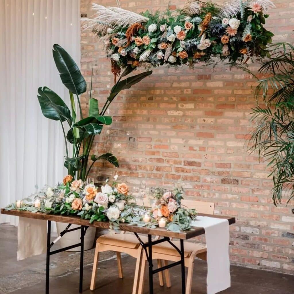 In this image, we turn to the lush and green setting of Garfield Park Conservatory, where romance fills the air. Tall floral centerpieces from Studio Poppy were the star of the show, enhanced by the subtle elegance of Tablescapes Event Rentals glassware. The natural tones and textures of the conservatory beautifully complemented the clean, modern tablescape, making this event an unforgettable blend of nature and design.