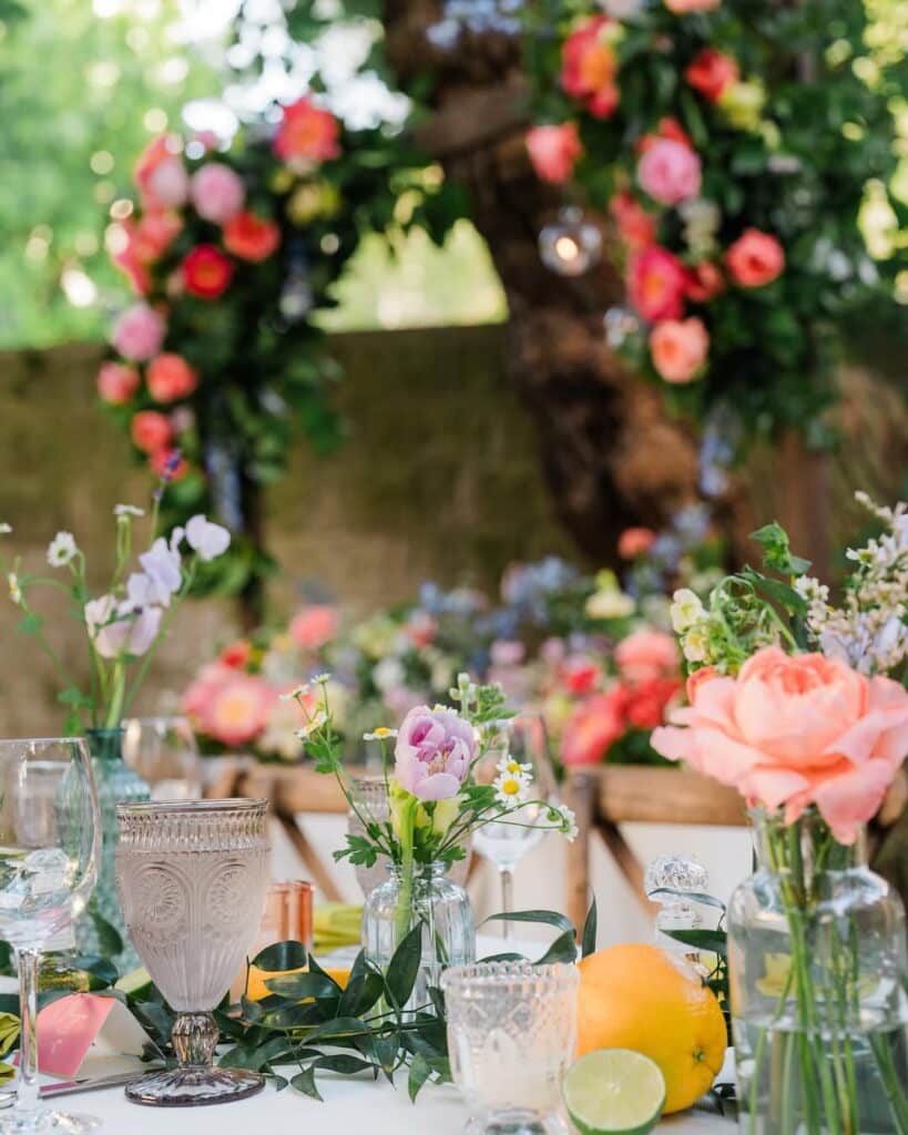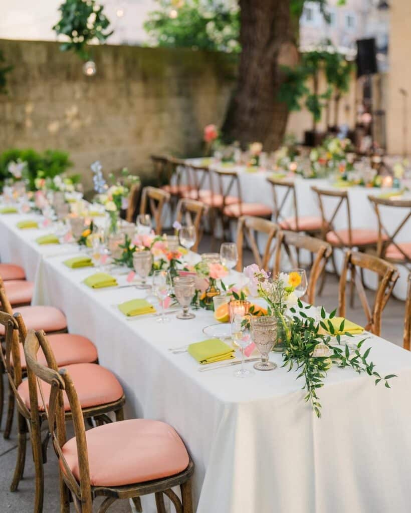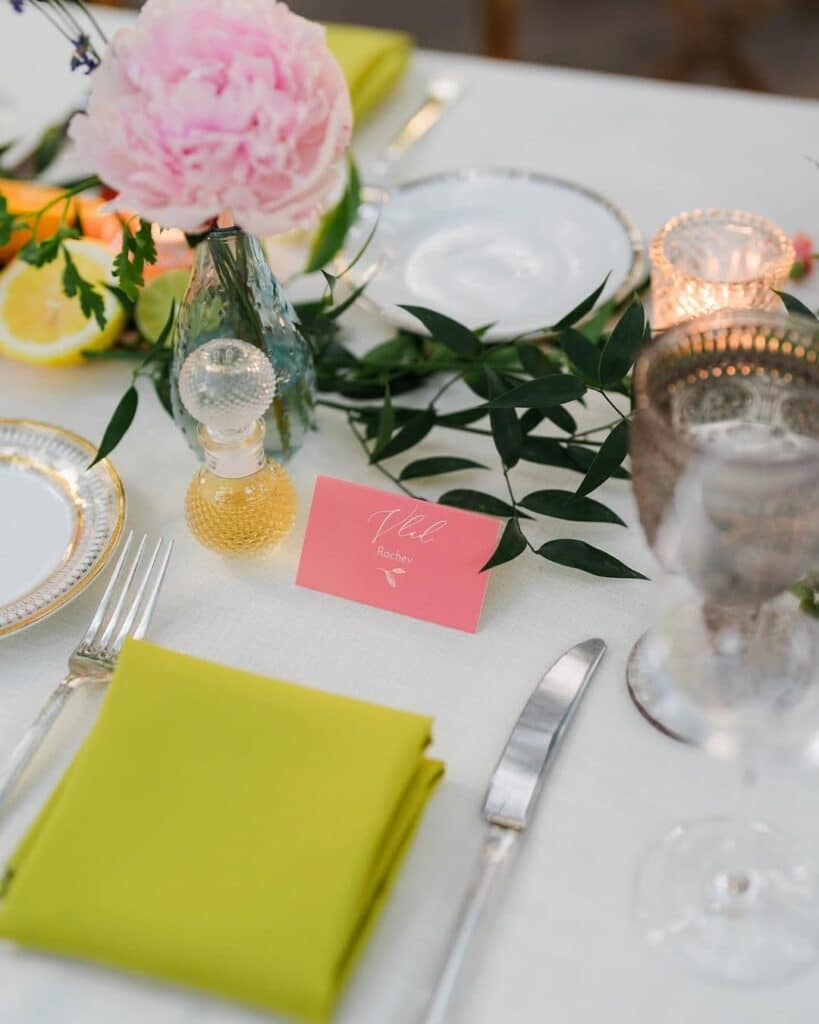The decor featured a refreshing mix of citrus hues and soft pastels, creating an atmosphere of lively sophistication. Pops of coral, blush, and mustard harmonized with crisp white linens, while lush greenery wove through the tables, offering a fresh garden-like feel. Lemons and limes nestled among delicate florals added a playful yet refined touch to the table decor, making this wedding a perfect blend of nature and design.