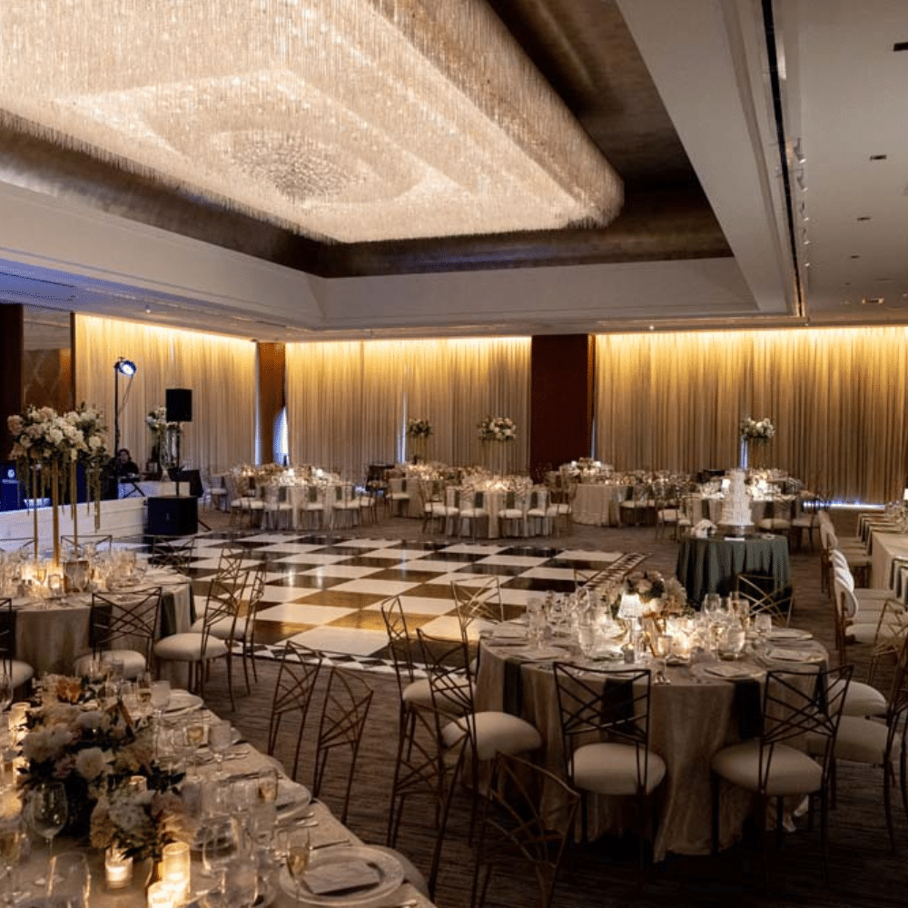 From the moment guests entered the ballroom, they were greeted by a soft, glowing ambiance created through layered lighting and thoughtful tablescape design. Tablescapes Event Rentals was proud to contribute to the couple’s vision with an array of luxurious rentals, including our the Chameleon Gold Fanfare Chair.