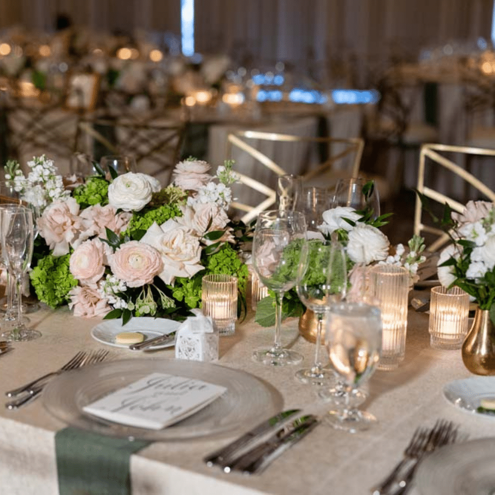 The sweetheart table with a delicate runner of florals and illuminated by candlelight showcased how even the smallest details can create an unforgettable experience. Crisp linens, green napkins, and custom printed menus with the couple’s names brought a personal touch to each setting.
