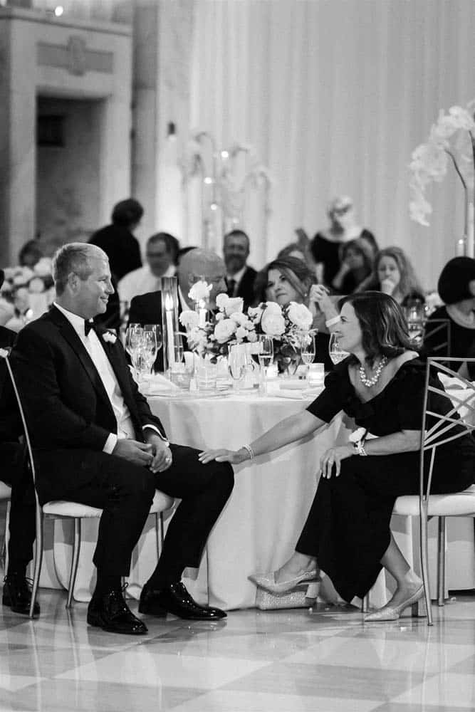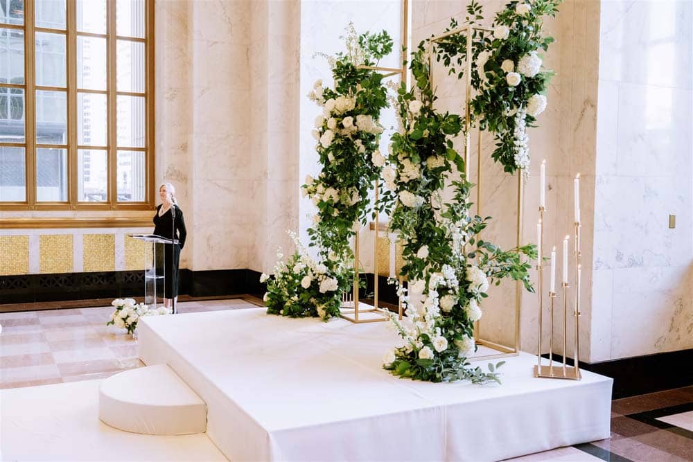 The stage for the wedding was centered in the ceremony area, with a stunning wedding stage draped in gorgeous florals in whites and bright greenery. Tablescapes adorned the sleek, raised stage platform so Cailey and Matt were the center of attention in the room when they exchanged vows under towering windows and golden accents. This beautifully designed marriage wedding stage decoration not only provided a beautiful and functional ambiance, but also perfectly complemented the grandeur of the setting. The combination of floral installations and the modern stage design provided an exquisite hint of contrast of romance and architectural drama.