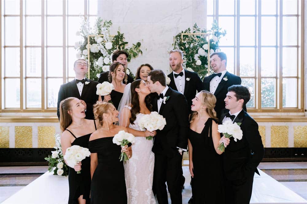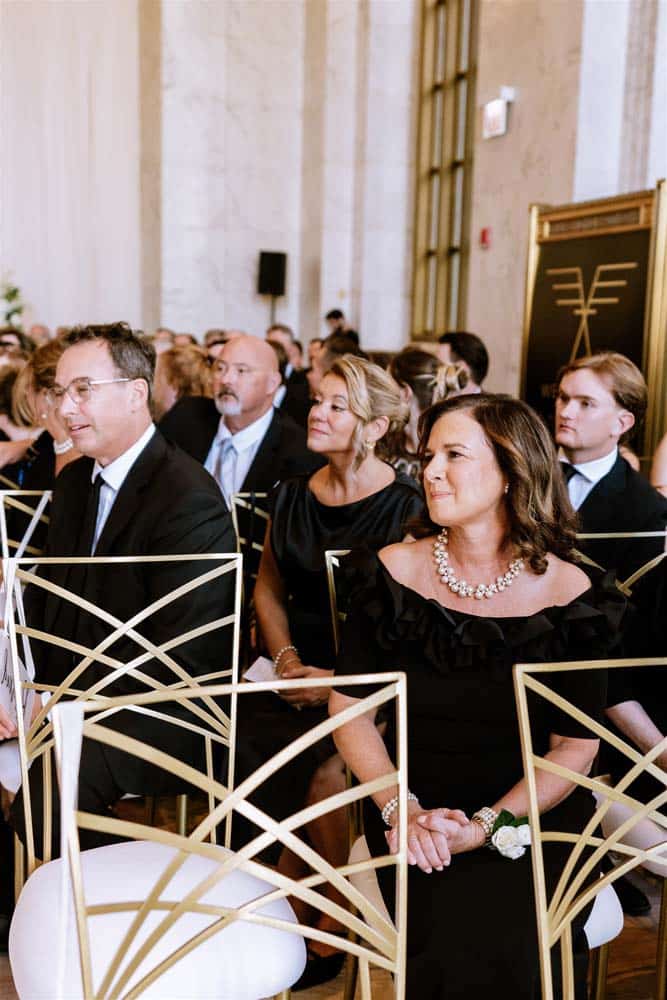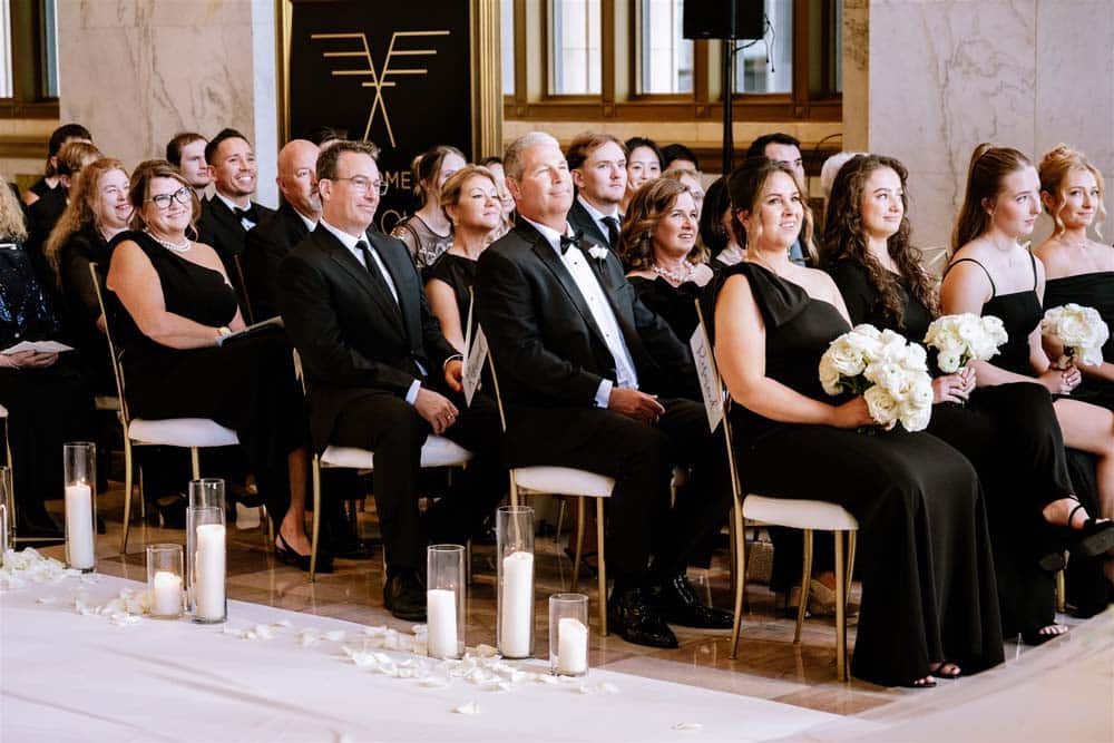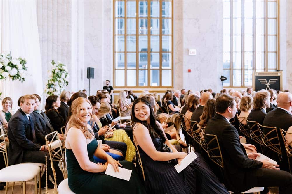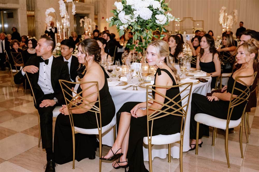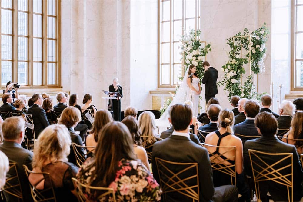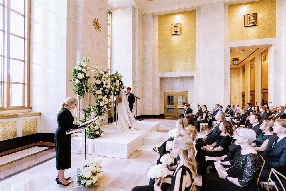 Cailey and Matt’s wedding at the Old Post Office in Chicago felt both grand and contemporary, with the venue’s history framing a sleek celebration. With its soaring ceilings, marble columns, and gilded accents, this landmark venue set the stage for a celebration that was both timeless and enchanting. Enhancing the beauty of this space was a thoughtfully designed wedding stage and ceremony and reception setting, brought to life with rentals from Tablescapes Event Rentals.