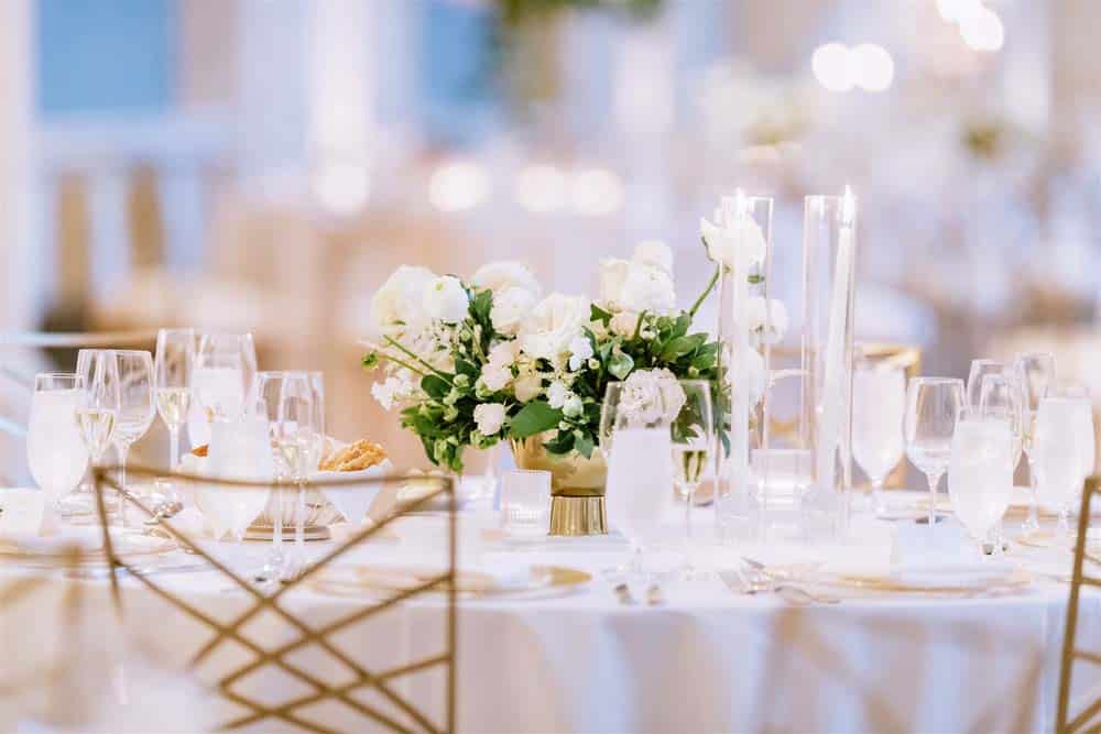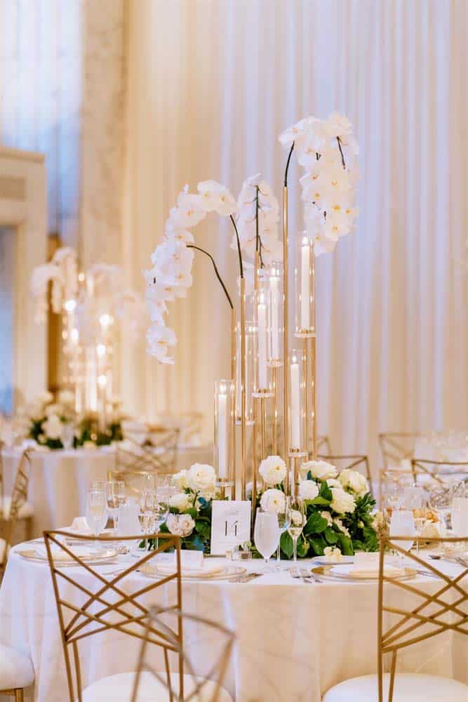 Perhaps the most memorable part of Cailey and Matt’s wedding day was the continuity with which the design carried over from ceremony to reception. The wedding platform wasn’t a fleeting backdrop, but an evening design feature. The elegance of the stage platform was echoed in the reception layout’s symmetry, and the gold and white color scheme carried over from vows to dinner to dancing. This mindful continuity provided visitors with the impression that they were being welcomed to one cohesive, immersive celebration.