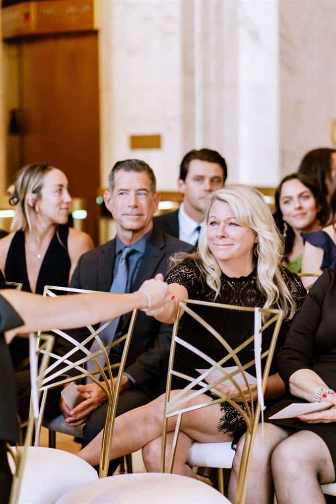As warm as the gold wedding chairs, a famous find for their chameleon nature that perfectly complements any theme. Their geometric backs added a modern touch to the reception and complemented the art deco accents of the Old Post Office building itself. Together, the gold chargers and gold wedding chairs created a unified look that tied the whole affair together.