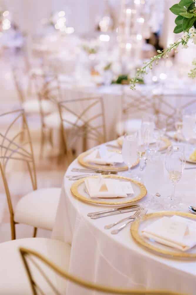 Following the ceremony, guests moved into an elegant and warm reception area. Tablescapes’ pièce de résistance rentals were gold plate chargers, which provided a touch of sophistication to every table setting, complemented by stark white linens and tall flowers. Combined with crystal glassware and smooth, modern flatware, the tables were luxurious and inviting.