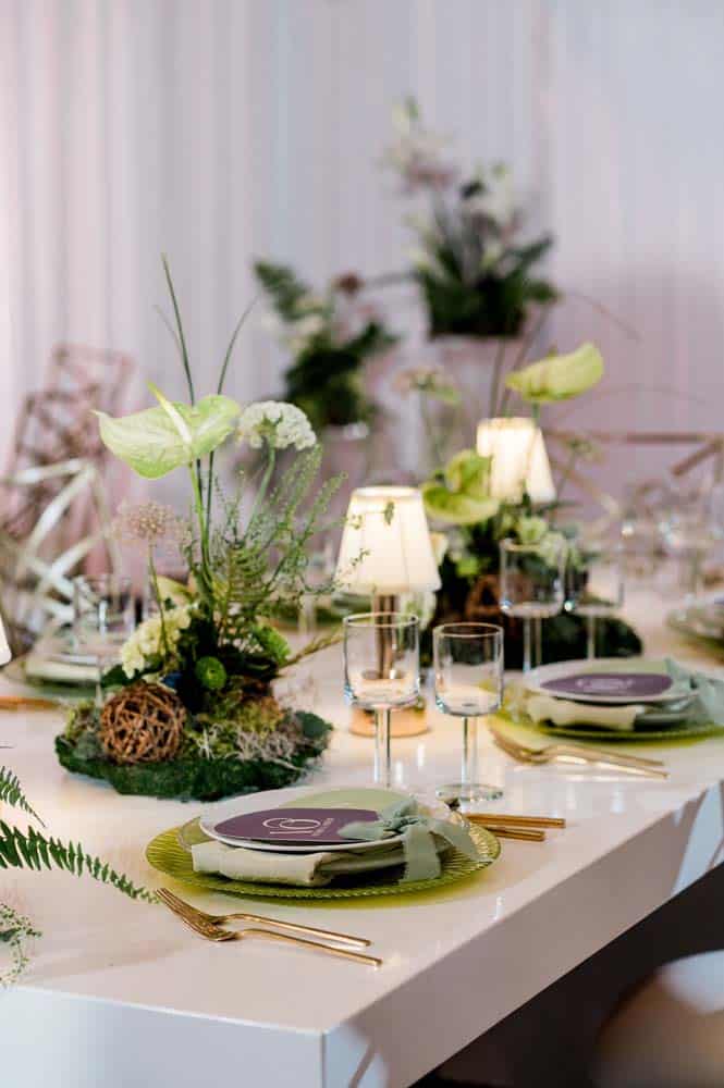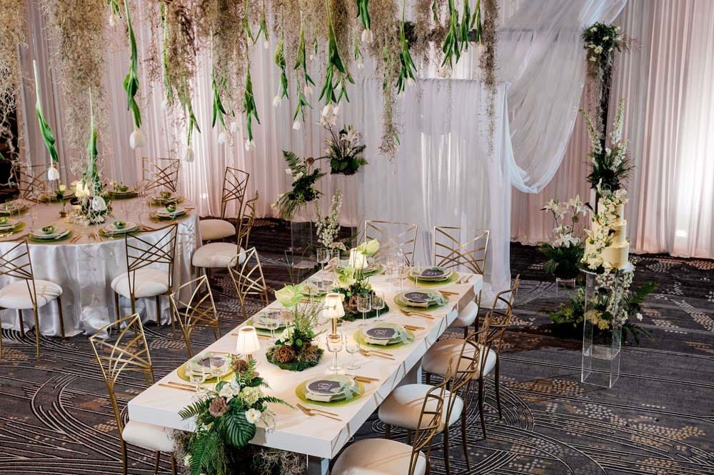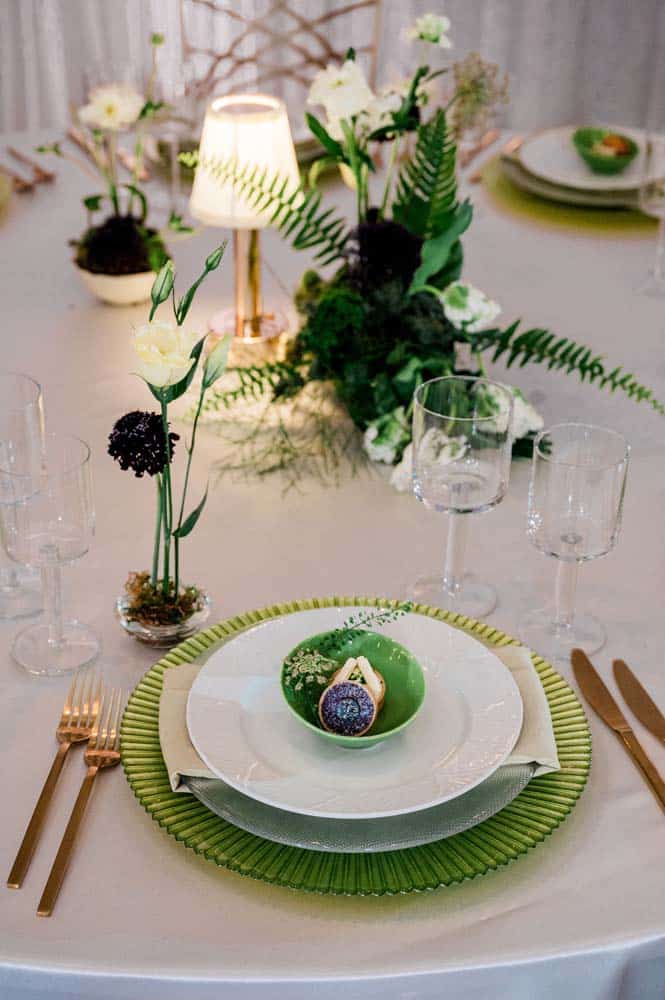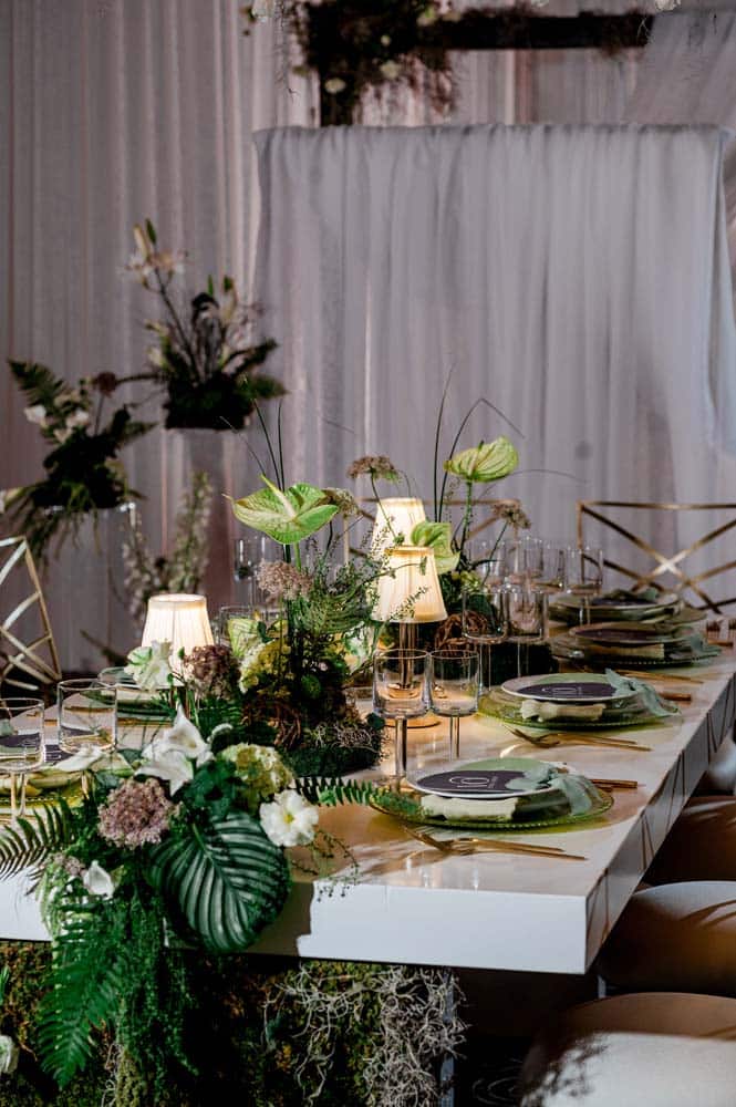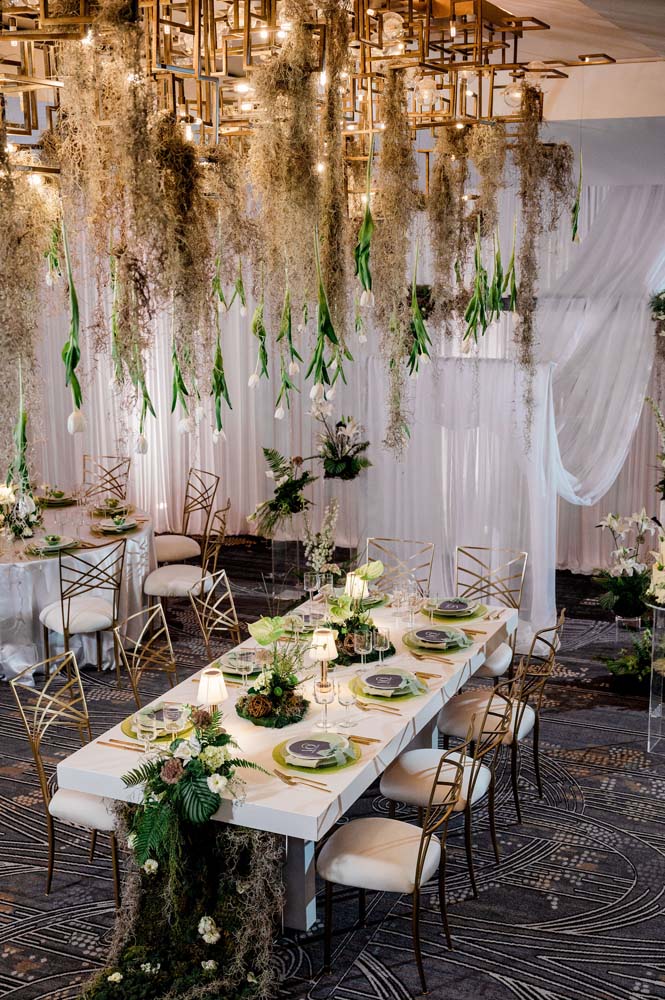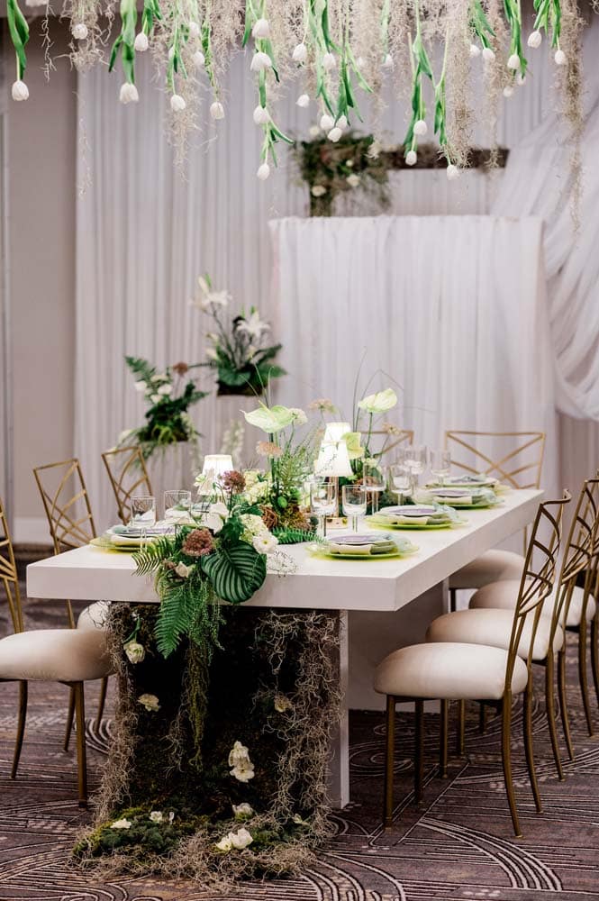 Our woodland-inspired setting set the mood for a whimsacle design with all sorts of textures and tones filling the atmosphere. A vision of elevated nature suspended overhead with soft green ribbons and white tulip blooms cascaded from a striking geometric chandelier. Moss, ferns, and airy florals spilled gracefully across the tabletop and down the sides, creating a living, breathing design that felt perfect against the backdrop of The Gwen’s ballroom, becoming a stage for a whimsical woodland escape.
