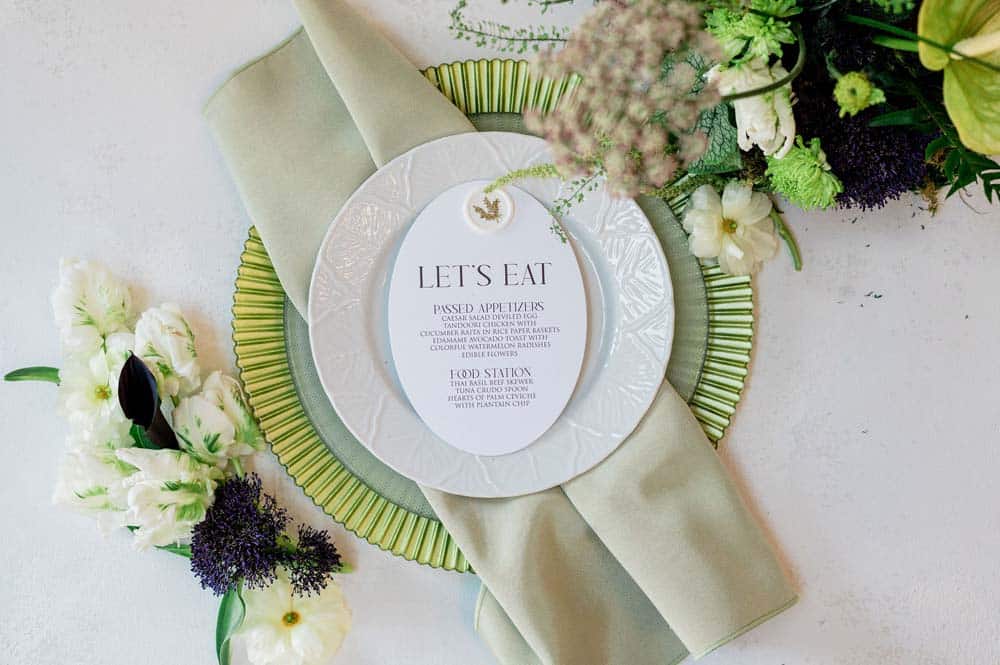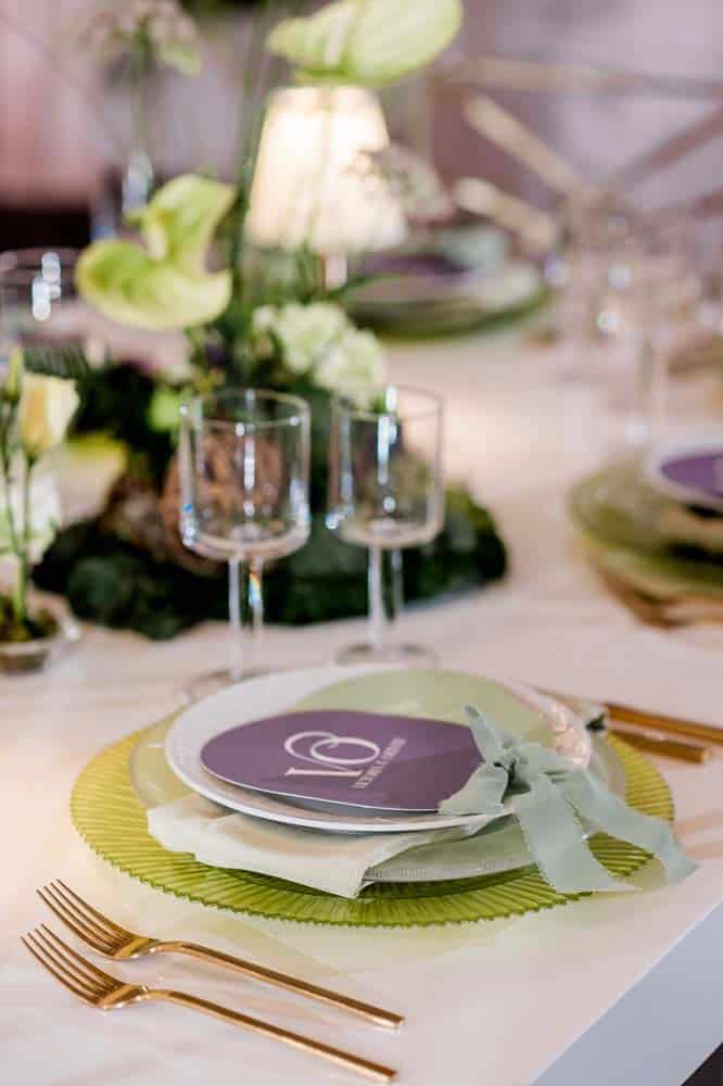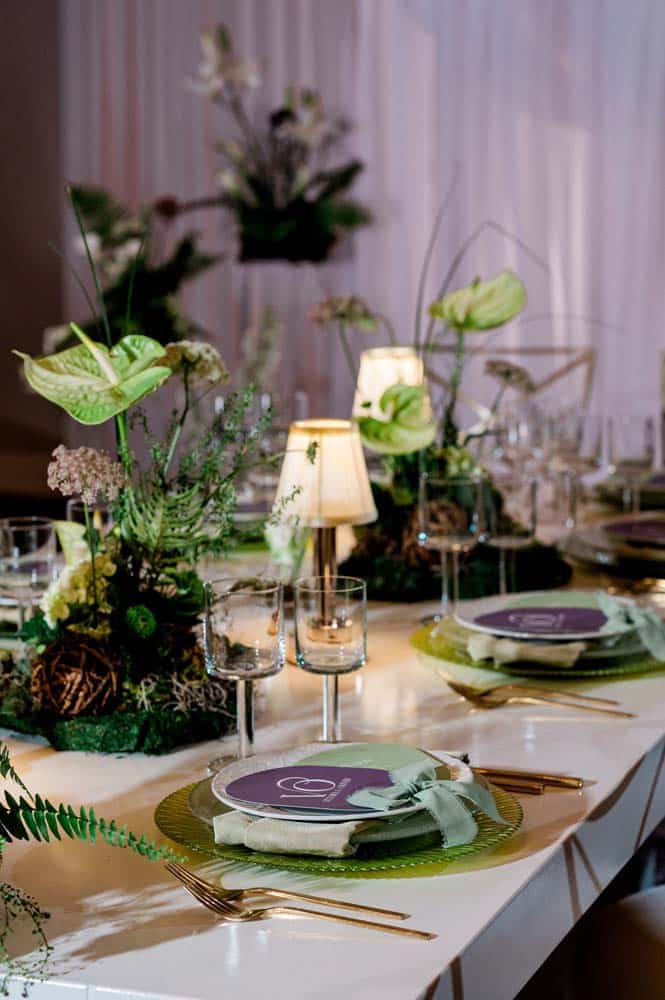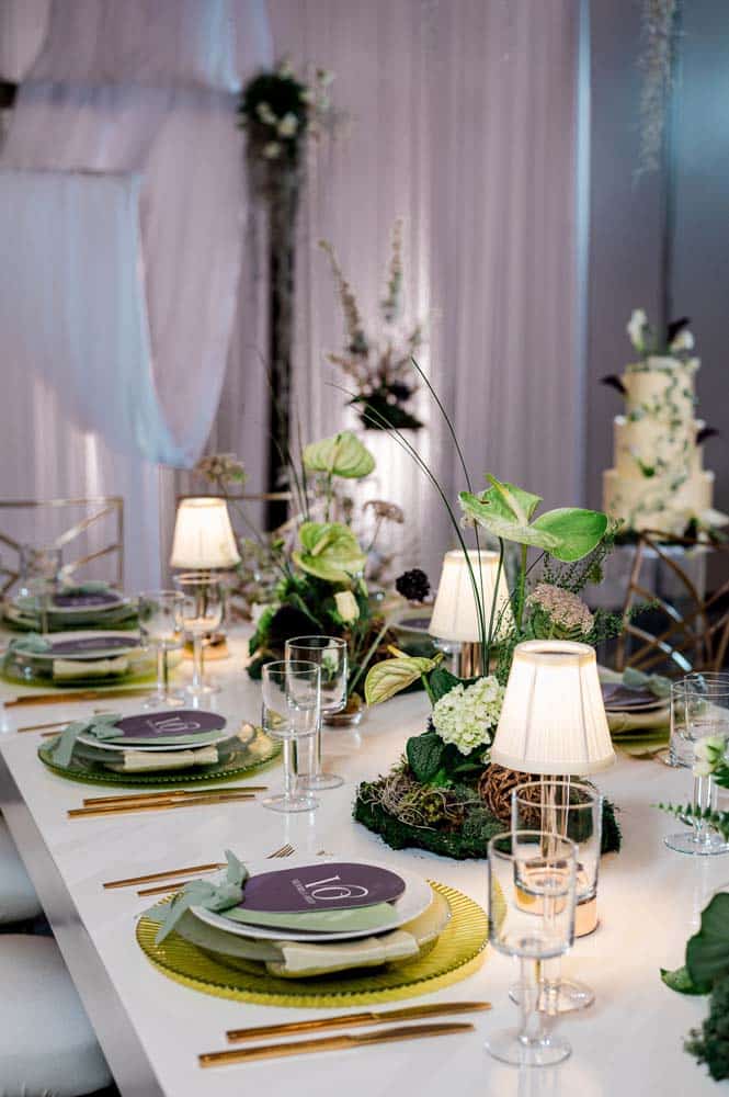 The design came to life with some of our signature rentals, including the Lime Blown Sand Chargers, which brought the pop of color needed to each place setting. Paired with our crisp white dinnerware and sage napkins, the charger anchored the design with freshness and sophistication. The entire table lit up with illuminating lamps and the ballroom’s statement chandelier. Our signature Gold Fanfare Chair added a modern contrast to the lush tablescape. The balance of natural textures and sleek design elements showcased exactly how Tablescapes’ curated collections elevate every detail of an event.