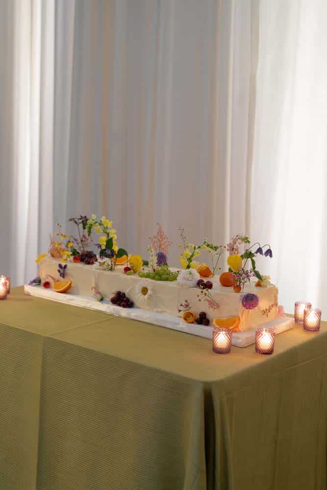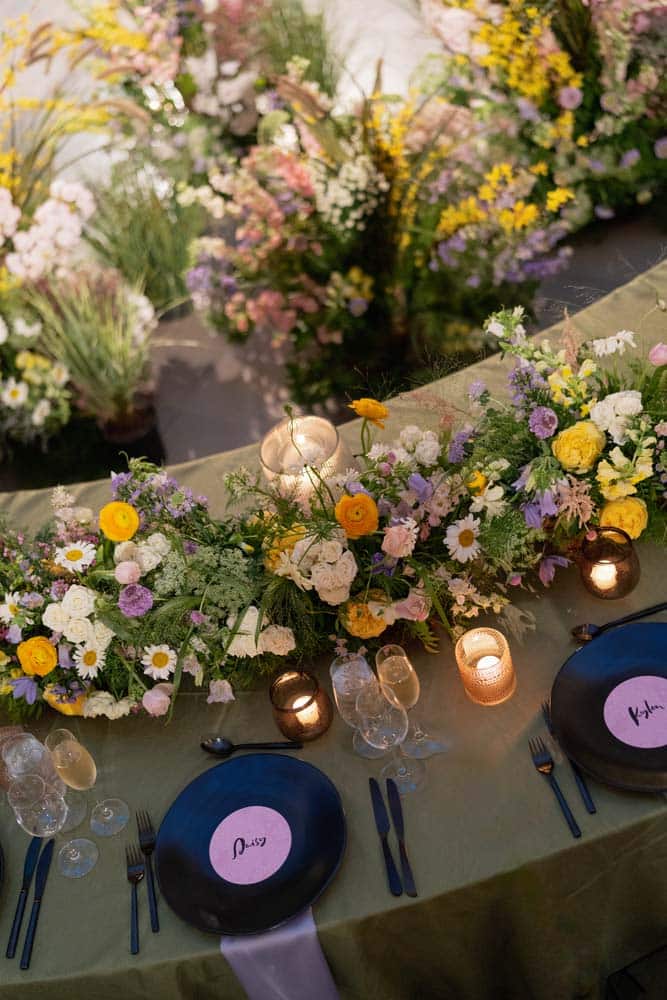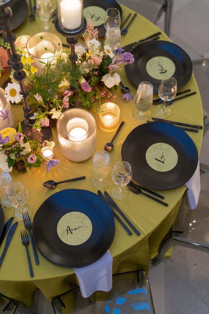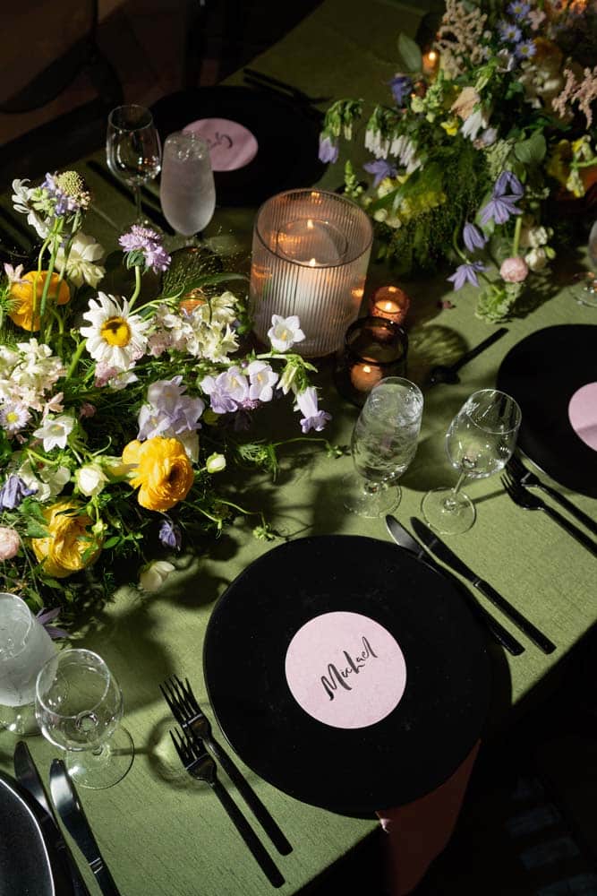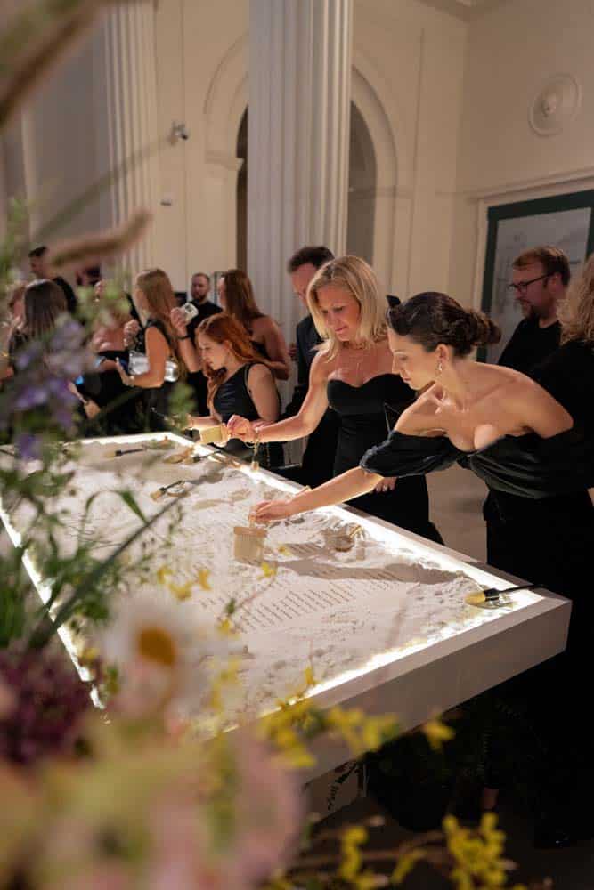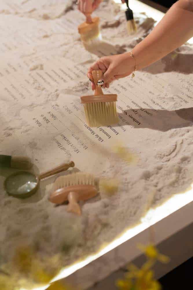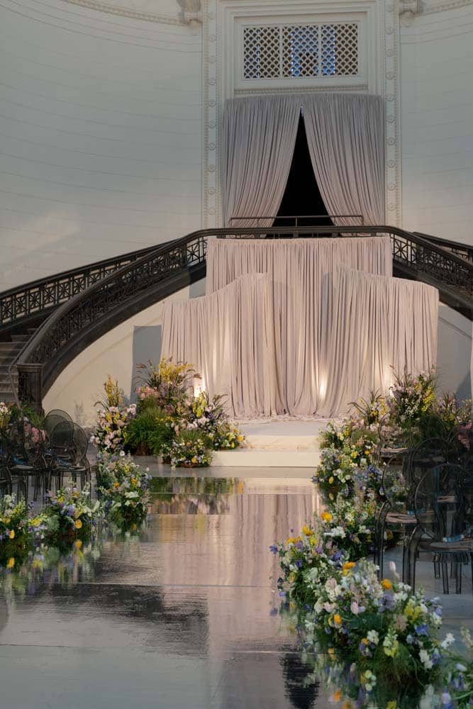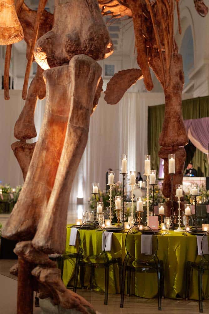 The scene was set beneath the Field Museum’s soaring ceilings, where soft draping cascaded down to meet a mirrored floor that reflected the grandeur of the space. Wildflower-inspired blooms spilled across the room in a playfully stylish palette of mustard and lilac, reflecting the couple’s desire for a wedding that balanced whimsy with refinement. Like pieces of art carefully arranged within a gallery, every detail was chosen to feel personal. Guests were even surprised with an excavation-themed seating chart that played into the world of paleontology.