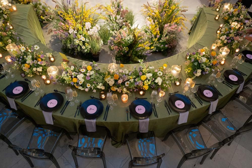 For seating, the couple selected ghost-style chairs that mirrored the clean, modern aesthetic, much like our own Smoke Mirage Ghost Chairs. With their translucent profile, these chairs created an airy, elevated look that let the museum’s architecture and vibrant floral palette shine.